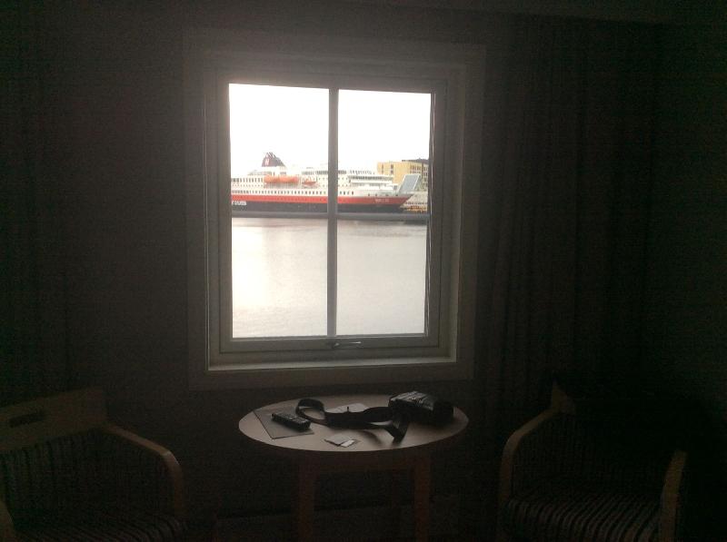 Utsikt från hotellfönstret = Hurtigrutten-båten